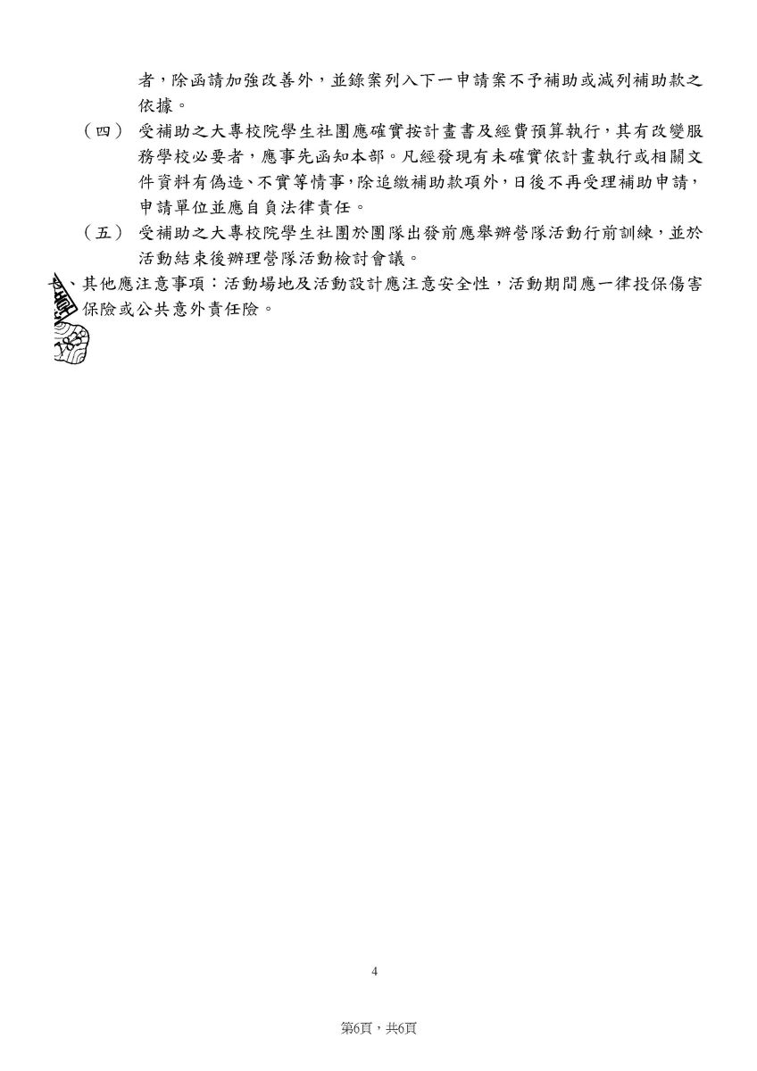 二、請各社團依「教育部補助大專校院辦理教育優先區中小學生營隊活動要點」相關規定辦理,詳情請見該要點第1頁、第2頁、第3頁及第4頁。