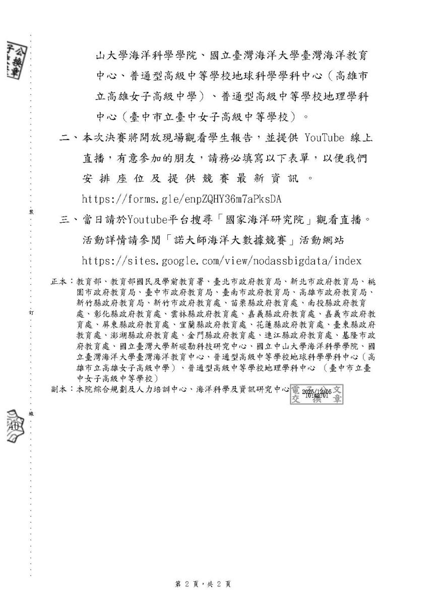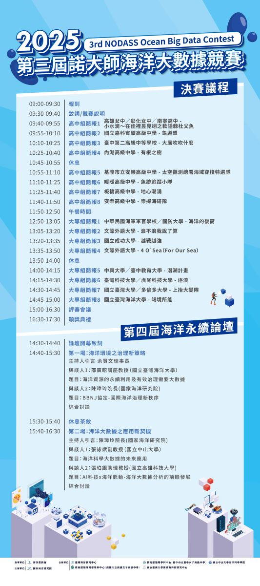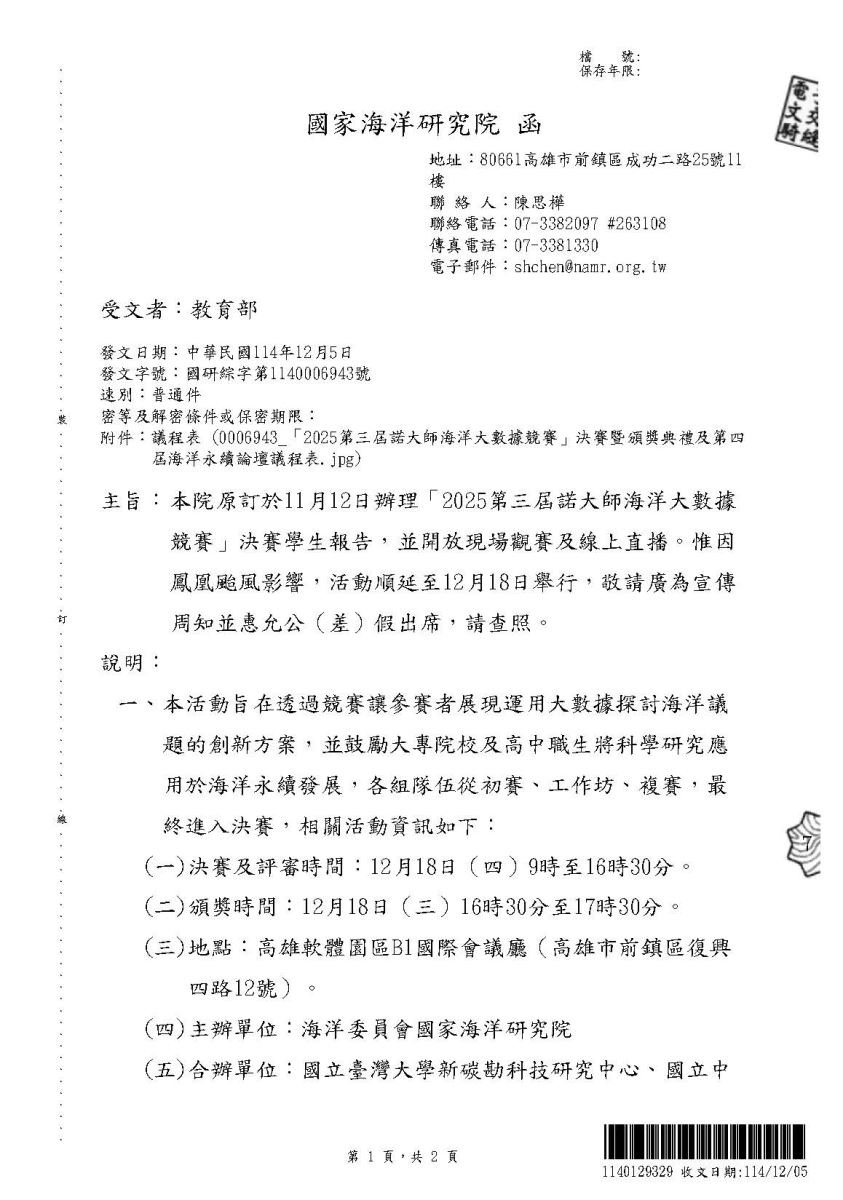國家海洋研究院辦理「2025第三屆諾大師海洋大數據競賽」決賽暨頒獎典禮,因故延至本(114)年12月18日(星期四)開放現場觀看(學生報告)和線上直播