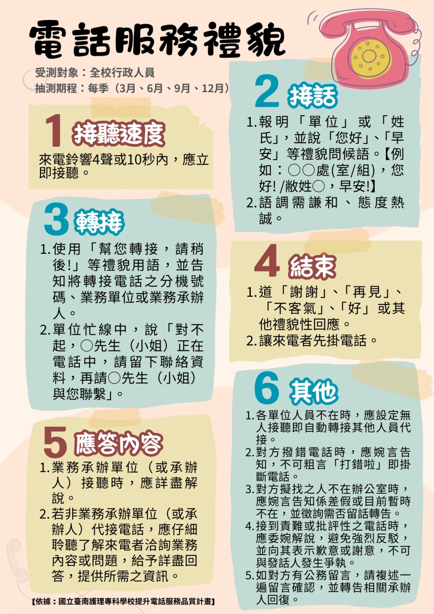 電話服務禮貌專區 114年12月4日校函 國立臺南護理專科學校提升電話服務品質計畫 國立臺南護理專科學校提升電話服務品質測試紀錄表 電話服務禮貌宣導海報 上次更新時間:2025/12/5 上午 11:44:09 瀏覽次數:55
