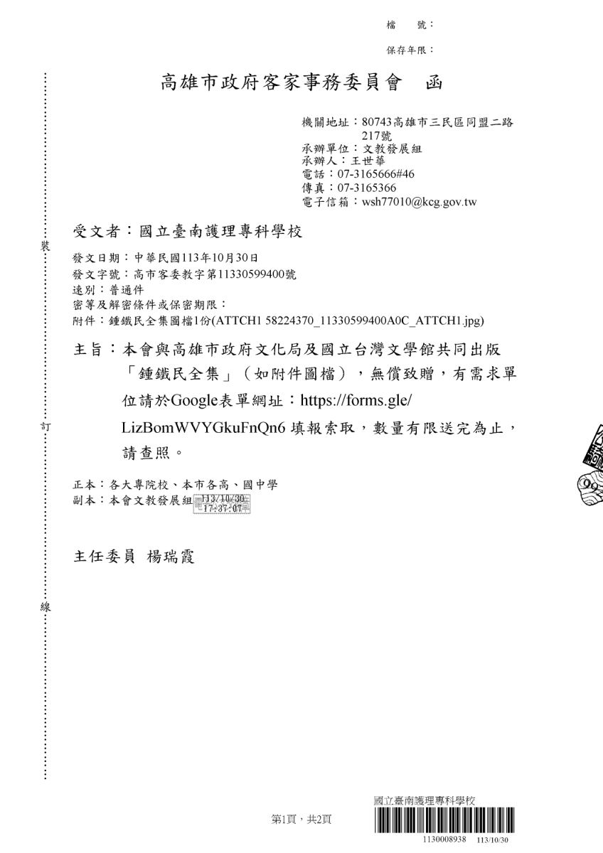 主旨:本會與高雄市政府文化局及國立台灣文學館共同出版「鍾鐵民全集」(如附件圖檔),無償致贈,有需求單位請於Google表單網址:https://forms.gle/LizBomWVYGkuFnQn6 填報索取,數量有限送完為止,請查照。