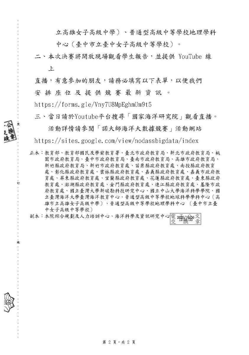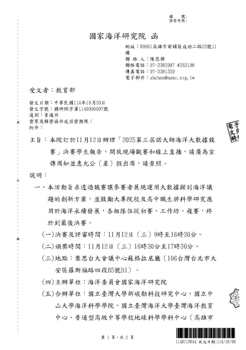 國家海洋研究院定於本(114)年11月12日(星期三)辦理「2025第三屆諾大師海洋大數據競賽」決賽,開放現場觀看(學生報告)和線上直播