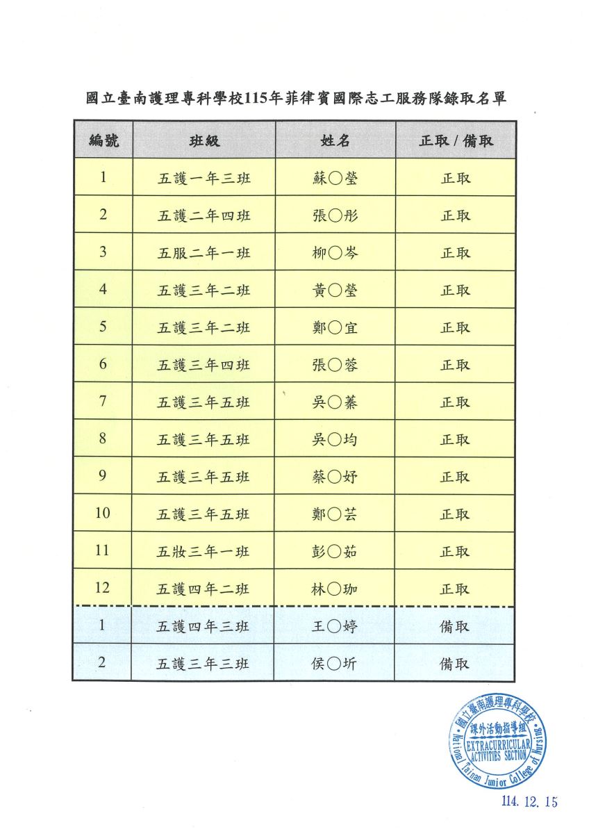 一、115年菲律賓國際志工服務隊遴選錄取名單如附件,請自行參閱。