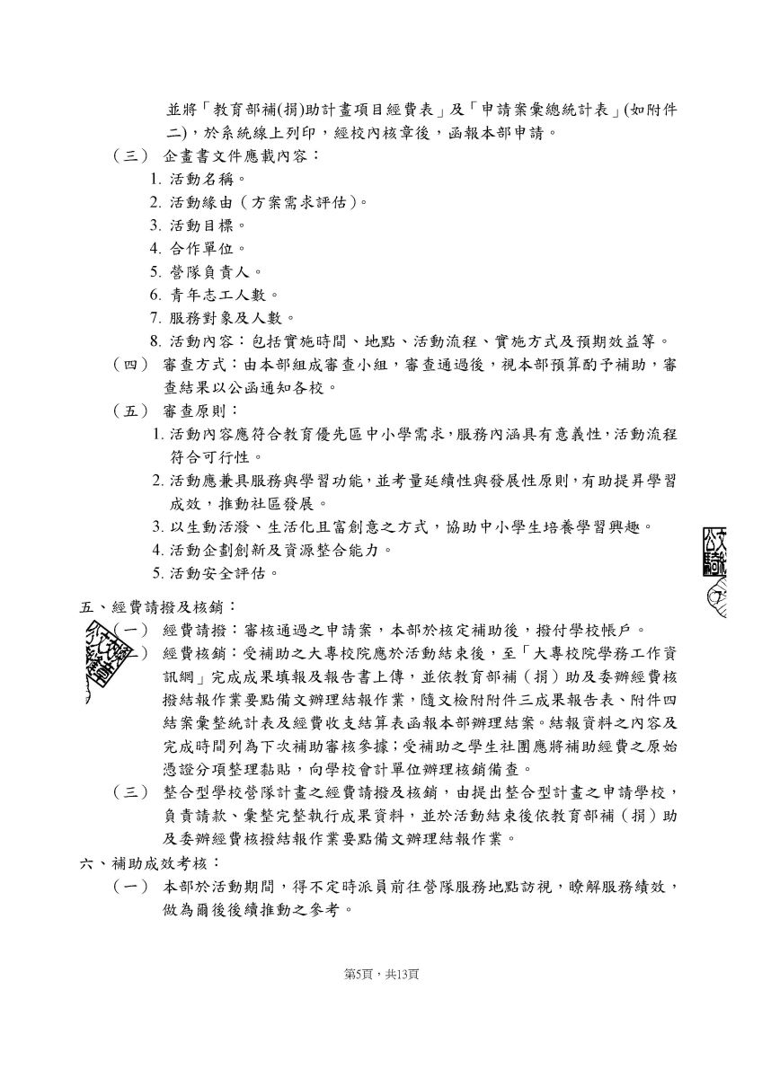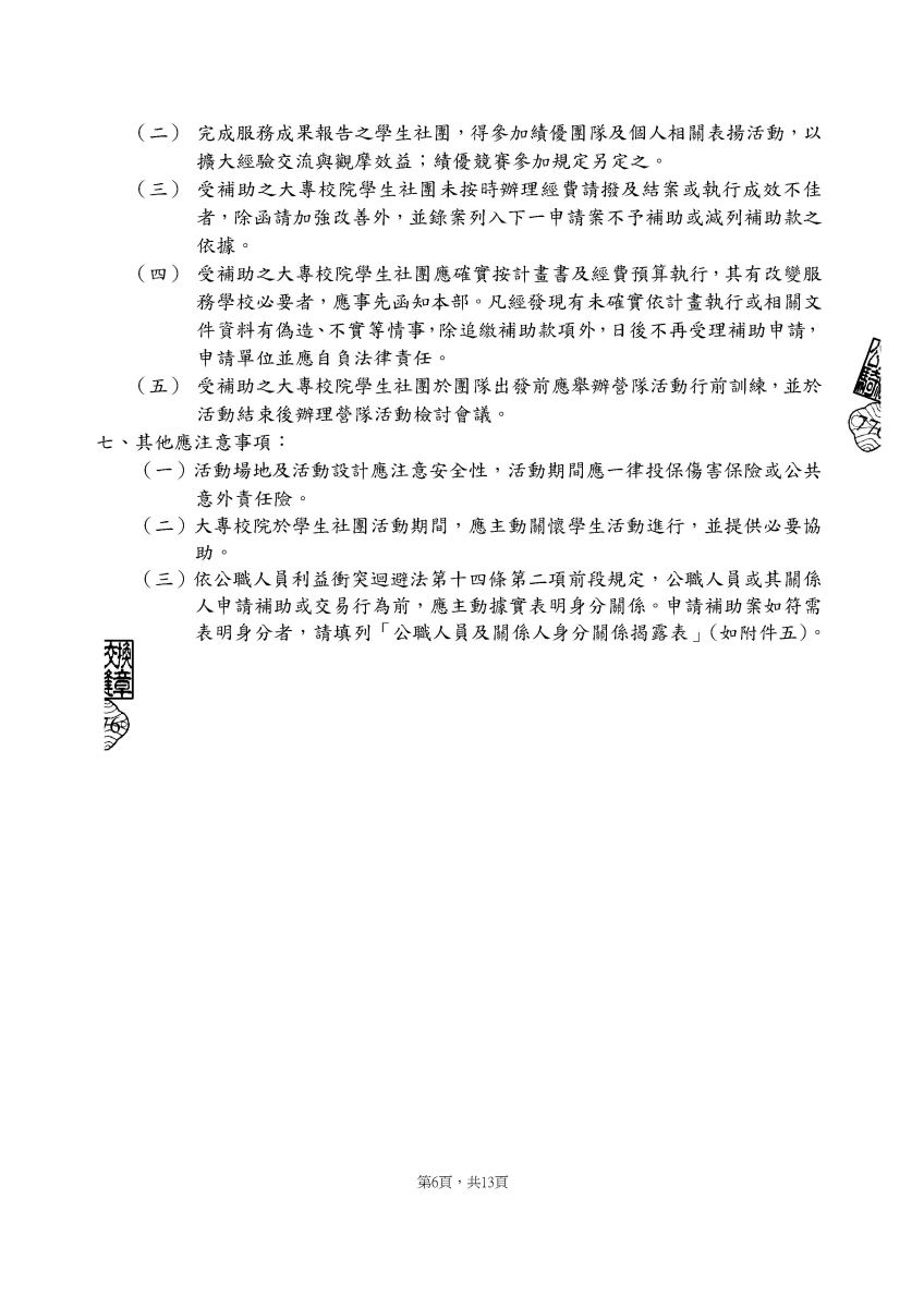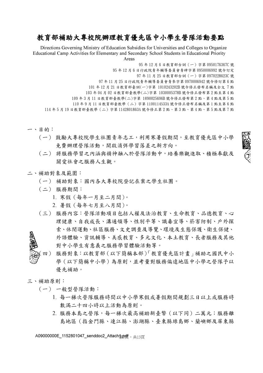二、請各社團依「教育部補助大專校院辦理教育優先區中小學生營隊活動要點」相關規定辦理,詳情請見該要點第1頁、第2頁、第3頁及第4頁。