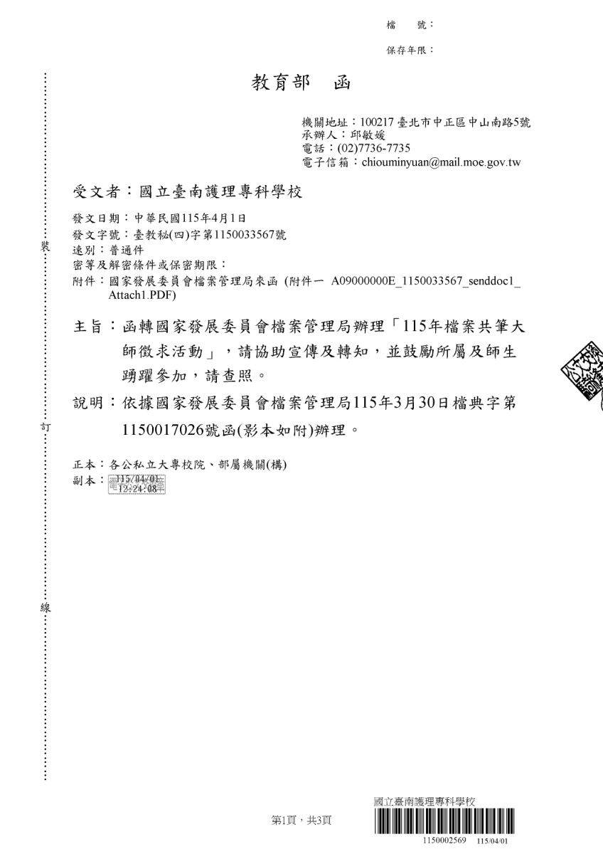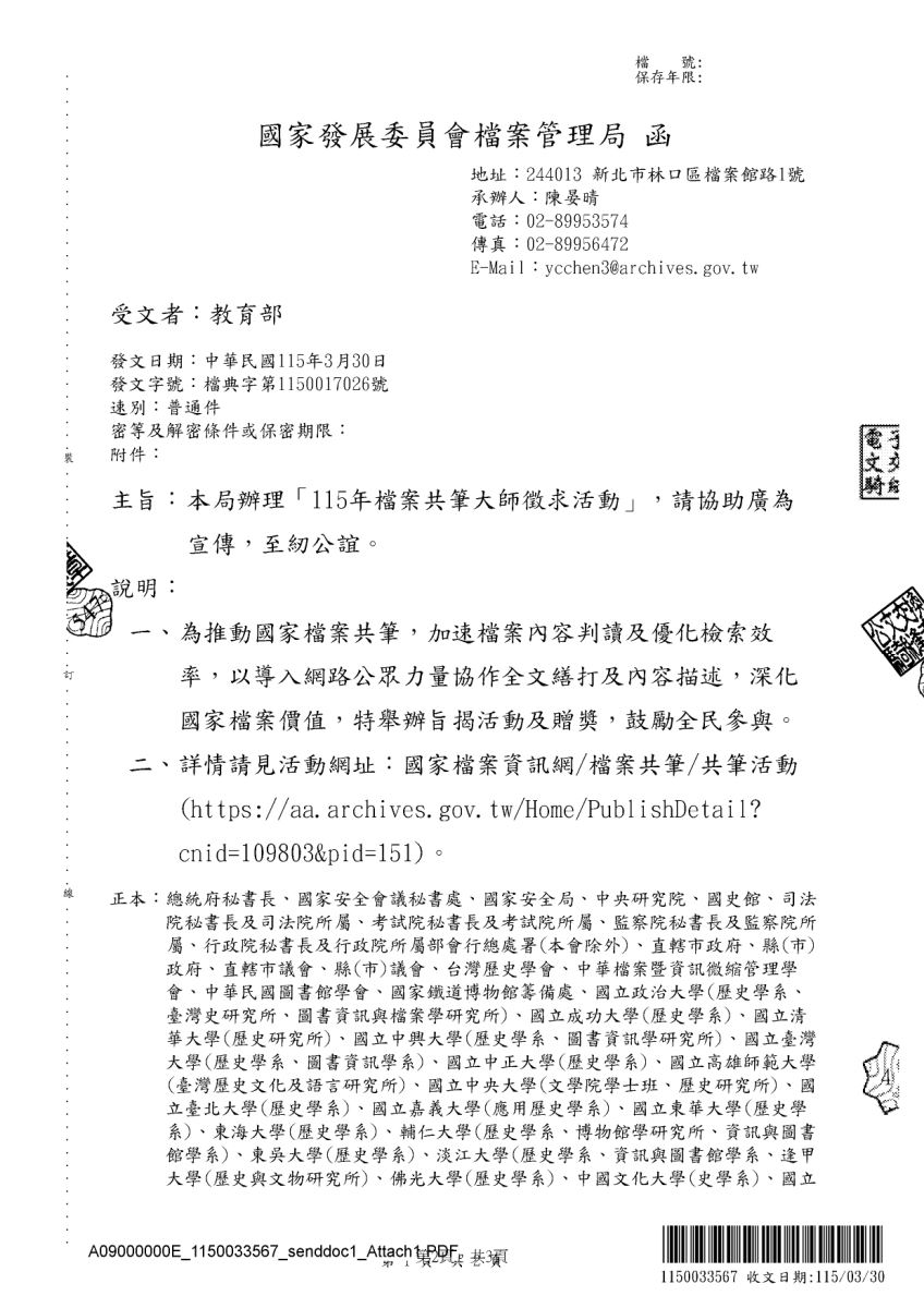 主旨:函轉國家發展委員會檔案管理局辦理「115年檔案共筆大 師徵求活動」,請協助宣傳及轉知,並鼓勵所屬及師生踴躍參加。
