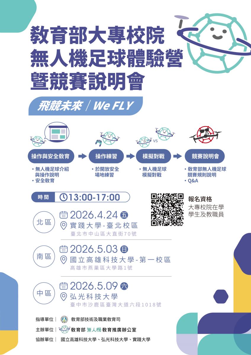 教育部規劃於115年4-5月期間辦理3場次「教育部大專校院無人機足球體驗營暨競賽說明會」